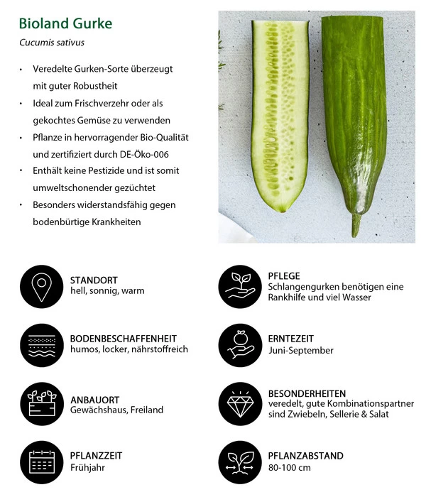 Die robuste Sorte wächst am besten im Gewächshaus und benötigt eine Rankhilfe. Pflanzen Sie die Gurke in einen lockeren, humosen Boden an eine geschützte, sonnige Stelle unterhalb der Veredelungsstelle ein. Zwischen den einzelnen Pflanzen sollten Sie einen Abstand von 80 x 100 cm einhalten. Die Gurken-Pflanzen sind durch die Veredelung besonders widerstandsfähig gegen bodenbürtige Krankheiten. Gießen Sie reichlich und düngen Sie Ihre Gurken mit einem organischen Dünger, sie haben gerade während der Wachstumsphase einen hohen Wasser- und Nährstoffbedarf. Sie können dieses frische Gemüse je nach Pflanzzeit von Juni bis September ernten.