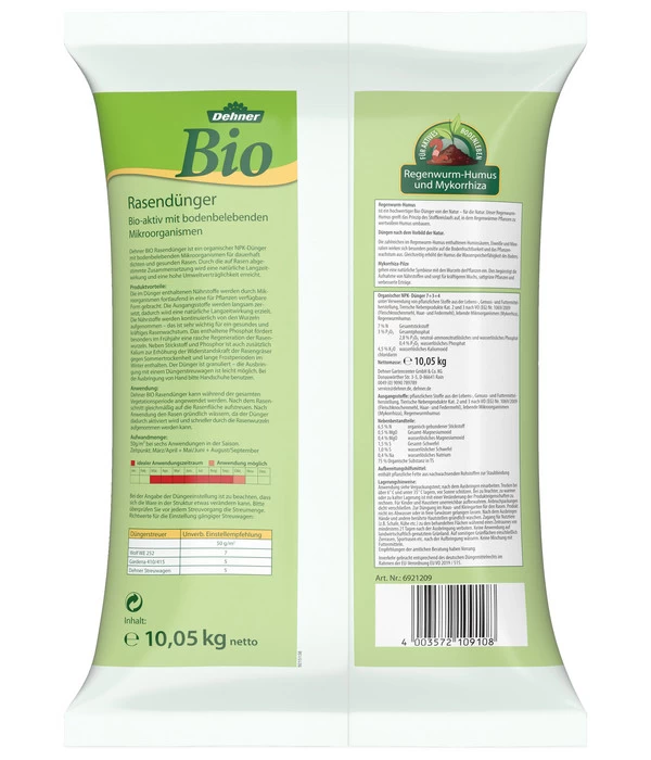 Jeder Gärtner möchte einen gesunden, sattgrünen Rasen, aber er weiß, dass er dafür einiges tun muss. Neben dem wöchentlichen Schnitt und der ausreichenden Wasserversorgung sind auch regelmäßige Düngergaben eine entscheidende Voraussetzung für eine prächtig grüne, gepflegte Rasenfläche. Mit dem Dehner Bio Rasendünger steht Ihnen ein hochwertiger, organischer Spezialdünger zur Verfügung, der Ihren Graspflanzen alle Nährstoffe gibt, die sie brauchen. Und noch ein bisschen mehr. Denn neben den klassischen ‚Zutaten‘ wie Stickstoff, Phosphat und Kalium im Mischungsverhältnis 7+3+4 enthält dieser Rasendünger auch Regenwurm-Humus und Mykorrizha-Pilze für ein aktives Bodenleben. Deshalb können Sie sicher sein, Ihrem Rasen mit dem Dehner Bio Rasendünger die beste Unterstützung zu geben, die er braucht, um Ihre Anforderungen in puncto Optik zu erfüllen.