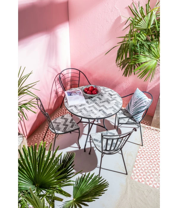 Zu der Mosaikplatte aus robusten Steinen wurde ein stabiles Gestell aus Eisen kombiniert, das dank seiner Pulverbeschichtung ebenfalls absolut witterungsbeständig ist. Deshalb können Sie den Dehner Mosaiktisch ‘Letizia‘ unbesorgt draußen unter freiem Himmel stehen lassen – auf dem Balkon oder in einer lauschigen Ecke im Garten. Besonders stimmig wird der Look natürlich, wenn Sie gleich passende Stühle oder Sessel dazu bestellen. Sie sehnen sich nach noch mehr mediterranem Flair? Voilà, dann arrangieren Sie noch einen duftenden Zitronenbaum, einen prachtvoll blühenden Oleander und ein paar Lavendelpflanzen in Terrakottatöpfen zu der Sitzgruppe.