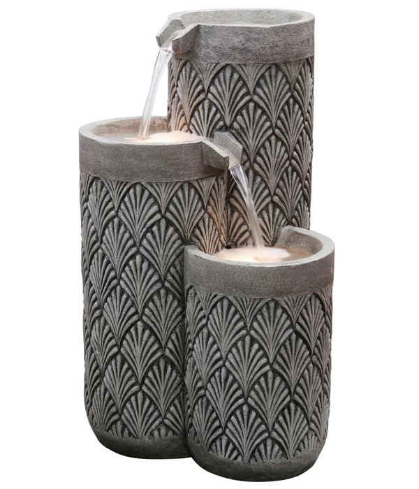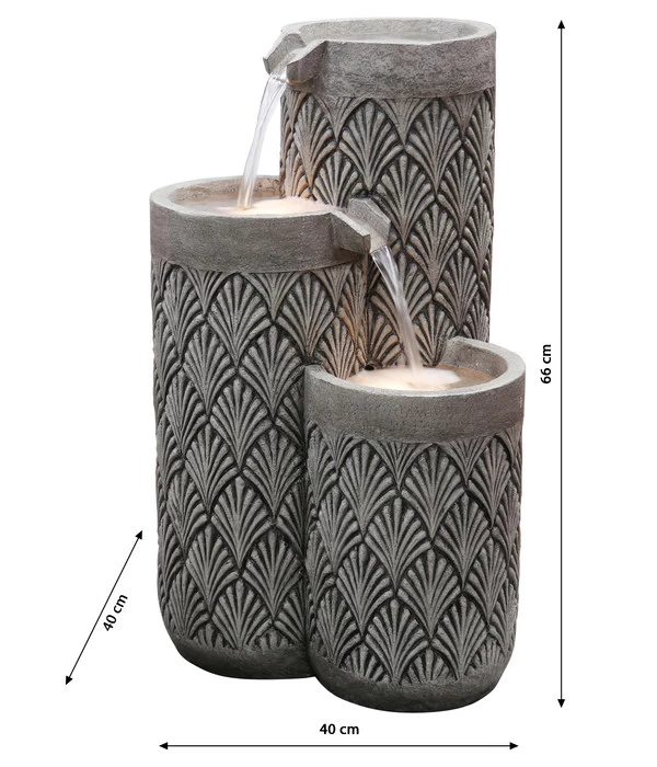 Es gibt viele Möglichkeiten, das Element Wasser in eine Gartenanlage zu integrieren. Mit dem Dehner Polyresin-Gartenbrunnen Palermo entscheiden Sie sich für eine der interessantesten und dekorativsten Arten. Denn die hohen, zylindrischen Wasserbehälter des Brunnens sind mit einem traditionellen Palmen-Motiv verziert, wie man es aus Nordafrika und den benachbarten Regionen kennt; Einflüsse, die auch in der Kultur Siziliens bis heute spürbar sind. Ein Deko-Objekt, das das Flair Ihrer Gartenanlage entscheidend mitprägen wird und zugleich aus Ihrem Gartensitzplatz eine Wellness-Oase macht. Denn neben seinem stilvollen Look wird auch das leise Säuseln des Wassers, wenn es von einer Ebene auf die andere rinnt, zur entspannten Atmosphäre beitragen. Entspannt können Sie auch dem Aufbau des Brunnens entgegensehen, denn er kommt als Komplettset zu Ihnen, bei dem alles dabei ist, was Sie für die Montage brauchen: die Pumpe, der Trafo und die zwei LEDs. Bestellen Sie deshalb gleich den Dehner Polyresin-Gartenbrunnen Palermo für Ihre grüne Oase!