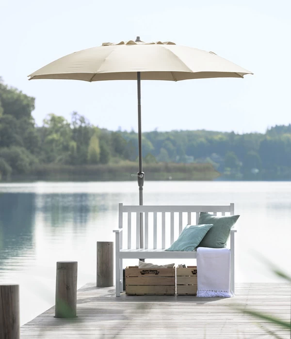 Die Pulverbeschichtung macht das Aluminiumgestell des Sonnenschirms Paros sehr wetterbeständig. Auch die Stoffbespannung des Sonnenschirms ist unempfindlich gegenüber Witterungseinflüssen und wirkt durch eine spezielle Imprägnierung wasserabweisend. Sollten Sie also von einem leichten Regenschauer überrascht werden, sitzen Sie dennoch im Trockenen. Mit einer Handkurbel lässt sich der moderne Rundschirm ganz einfach schließen und bei Bedarf wieder öffnen. Jetzt fehlt nur noch ein passender Schirmständer aus unserer großen Auswahl – und der Dehner Markenqualität Schirm Paros wird Ihnen ausreichend Sonnenschutz für viele Stunden im Freien bieten!