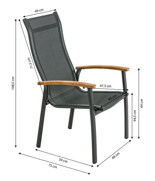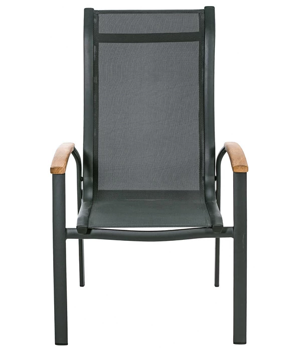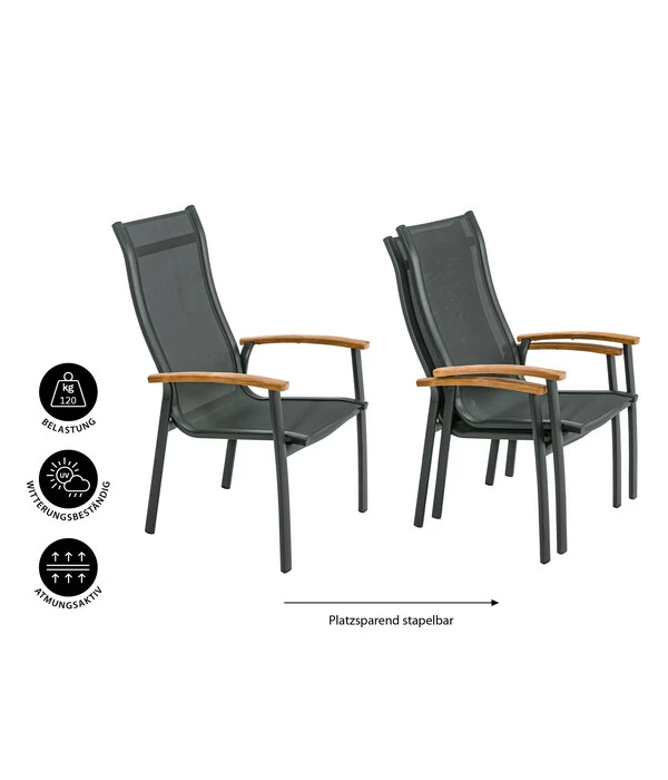 Für den besonderen Sitzkomfort ist vor allem das moderne Gewebe auf der Sitz- und Rückenfläche verantwortlich, das genau den richtigen Mittelweg zwischen angenehm stützen und flexibel nachgeben findet, denn es ist elastisch und formstabil zugleich. Textilene ist außerdem strapazierfähig witterungsbeständig, atmungsaktiv, UV-fest, wasserabweisend und schnell trocknend. Und pflegeleicht ist das Material außerdem. Auch das Aluminium-Gestell des Stuhls ist wetterfest, so dass der Dehner Stapelstuhl ‘Chicago Wood‘ bestens für ein langes Leben unter freiem Himmel ausgestattet ist. Ein ästhetisches Sahnehäubchen sind die Armlehnen aus Teakholz, die die elegante Anmutung des Stuhls unterstreichen.
