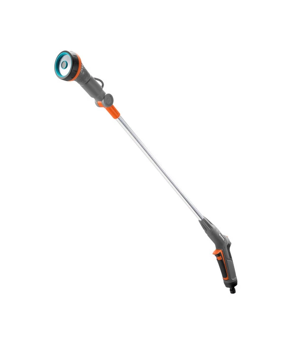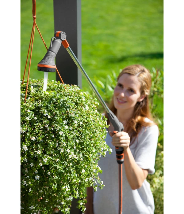 Mit seiner Länge von 90 Zentimetern ermöglicht es der GARDENA Comfort Blumenampel-Gießstab entfernte und ansonsten nur schwer zugängliche Pflanzen zu gießen. Damit zeigt er sich als ideales Hilfsmittel für das Bewässern großer Blumenampeln. Für die perfekte Anpassung an die jeweilige Situation lassen sich diverse Einstellungen am GARDENA Comfort Blumenampel-Gießstab vornehmen. Der Sprühkopf ist beweglich und kann in einem Bereich von 200 Grad frei geschwenkt werden, um an alle gewünschten Stellen und Blumentöpfe gelangen zu können. Gleichzeitig sind die Sprühmenge und die zugehörigen Sprühbilder, von Perlen bis zu einem Strahl, veränderbar.