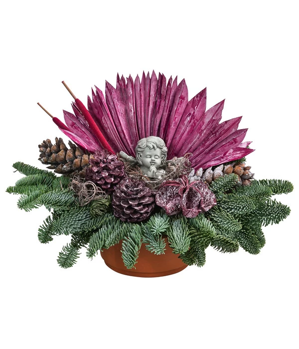 Möchten Sie Ihrem geliebten Menschen eine besondere Erinnerung schenken? Das handgefertigte Grabgesteck in einer Terrakotta-Schale verbindet die Schönheit der Natur mit berührenden Symbolen und ist exakt für derartige Anlässe gedacht. Die ovale Form und die moderne Farbgebung verleihen diesem exquisiten, handgefertigten Gesteck aus dem Hause Dehner eine einzigartige Eleganz. Die zentralen Elemente, eine liebevoll gestaltete Engelsfigur und eine strahlende Palmsonne, symbolisieren Trost und Hoffnung. Zeigen Sie Ihre Liebe und Verbundenheit durch diese einzigartige Kreation.