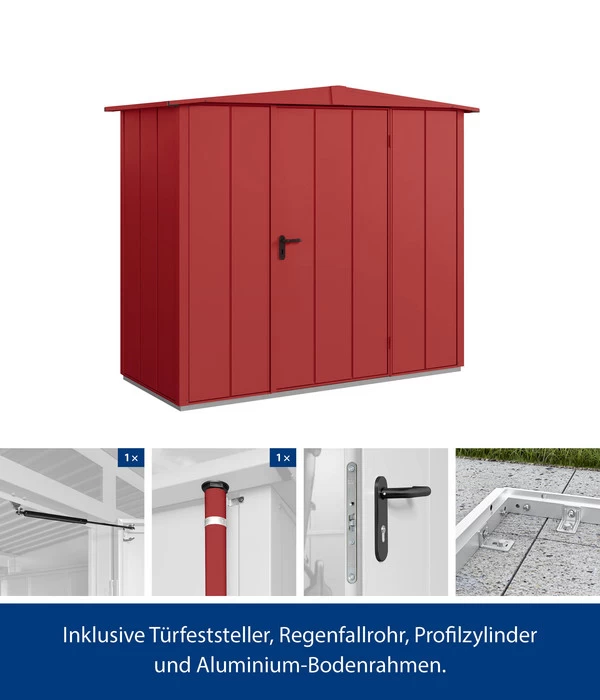 Dank seiner robusten Konstruktion aus Aluminium und Stahl erweist sich das Berry-Gerätehaus Modern-S Typ 1 aus dem Hause Hörmann als äußerst langlebig. Mit seinem zeitlosen Design und den vielen zur Auswahl stehenden Farbenvarianten passt es sich dem Umfeld problemlos an. So hat auch das Auge des Betrachters etwas davon. Lassen Sie nun einmal Ihrer Fantasie freien Lauf und stellen Sie sich vor, wie wunderschöne Blumen einen herrlichen Kontrast zur ruhigen Wandfläche Ihres Gerätehauses bilden. Da geht Ihnen das Herz auf. Also warten Sie nicht mehr lange! Drücken Sie jetzt den Bestellbutton und freuen Sie sich auf den Aufbau dieses schönen Hörmann Berry-Gerätehauses Modern-S Typ 1!
