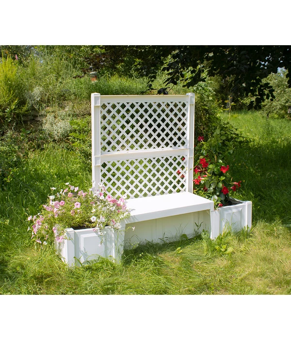 Die KHW Kunststoff-Gartenbank Kopenhagen ist eine stabile und formschöne Gartenbank, die jeden Garten um einiges romantischer und stilvoller macht. Das Set beinhaltet außerdem zwei Pflanzkästen, die Sie individuell mit Ihren Lieblingsblumen befüllen können, und einen Spalier. Damit eignet sich die Gartenbank auch optimal als stimmungsvolle Trennung zwischen zwei Gartenabschnitten oder als besonderer Hingucker in der Mitte Ihrer Grünfläche. Ihre Gäste werden Augen machen! Die Lieferung der KHW Kunststoff-Gartenbank Kopenhagen erfolgt in Einzelteilen, die sich aber einfach und ohne zusätzliches Werkzeug montieren lassen.
