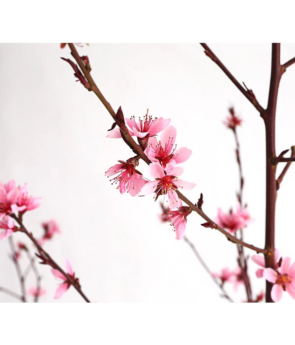 Der Pfirsich ‘Rubira‘ wird von manchen auch Blutpfirsich genannt, denn als erstes wird unser Blick natürlich von dem dunkelroten Laub angezogen, das dem eines Ziergehölzes ebenbürtig ist und im Garten einen dekorativen Farbakzent setzt. Auch zur Blütezeit im Frühjahr wird der Pfirsich ‘Rubira‘ zum bewunderten Hingucker im Garten werden, wenn die Äste über und über mit rosafarbenen Blüten bedeckt sind. Und fesselte das attraktive Gehölz vom Frühling bis zum Sommer vor allem die Liebhaber optisch interessanter Pflanzen, so gesellen sich im Spätsommer noch die Obst-Gourmets hinzu. Denn Eingeweihte wissen, dass der Pfirsich ‘Rubira‘ kein Ziergehölz ist, sondern eine seltene Pfirsichsorte, die im Herbst wunderbar süß-aromatische Früchte trägt. Die außen ebenfalls rötlichen, innen grünlichen Pfirsiche können roh verzehrt oder zu verschiedenen Fruchtspeisen verarbeitet werden.