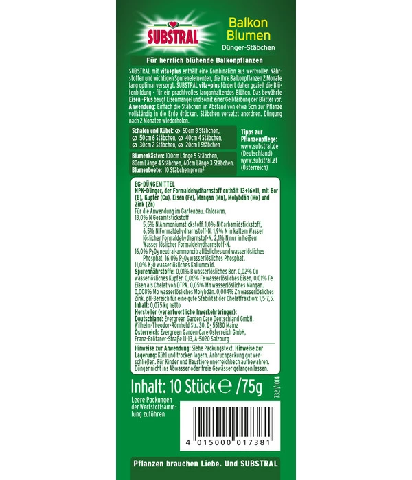 Die Wirkung der Düngestäbchen hält für volle zwei Monate vor, sodass Sie sich in diesem Zeitraum nicht weiter um die Nähstoffversorgung Ihrer Blumen kümmern müssen. Außerdem ist der Dünger chloridarm, wodurch er sich auch für empfindliche Pflanzen eignet. Bestellen Sie die Substral® Düngestäbchen für Balkonblumen noch heute online, um sich schon bald über wunderschöne Blüten und ein üppiges Blattgrün freuen zu können!