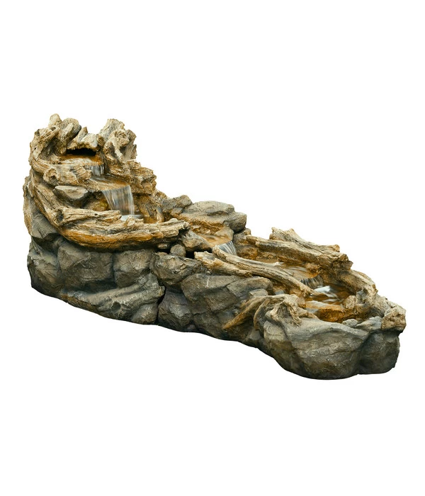Wie konnte eine derart naturgetreue Szenerie entstehen, in der Felsen und verwitterte Holzteile wie aus der Natur geschnitten wirken, sich lebendig ein Bächlein über Jahre seinen Weg gebahnt zu haben scheint? Das macht Polyresin möglich, ein robustes, witterungsbeständiges Material, das sich sogar ideal künstlerisch verarbeiten lässt – wie es der Ubbink Gartenbrunnen Bachlauf Tripani eindrucksvoll unter Beweis stellt.