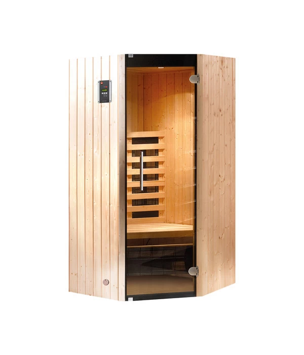 Bei der Weka Infrarotkabine Tanilla Eck besteht der Innenraum aus naturbelassenem, nordischem Fichtenholz, die Sitzbank hat eine passende ergonomische Lendenstütze. Abgerundet wird das hochwertige Komplettpaket durch die moderne Ganzglastür aus Sicherheitsglas in Graphit-Optik und den integrierten Halogenstrahler, die für ausreichend Licht und eine angenehme Atmosphäre in der Kabine sorgen. Dank der vorgefertigten Wand- und Deckenelemente können Sie die Weka Infrarotkabine Tanilla Eck schnell und unkompliziert aufbauen, vor allem auch, weil das Montagematerial und eine ausführliche Aufbauanleitung im Lieferumfang inbegriffen sind.