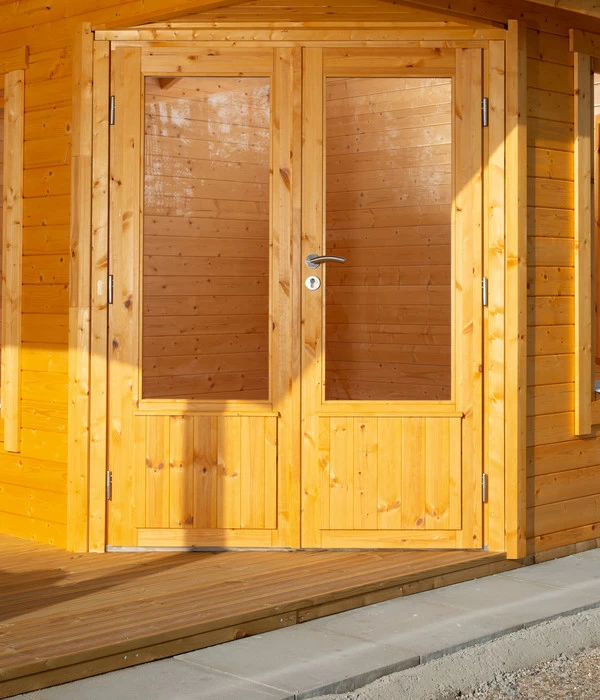 Die hochwertige Doppeltür des Wolff Finnhaus Gartenhaus Maja 40-B/1 inkl. Terrasse besteht aus verzugsfreiem Leimholz und garantiert viele Jahre beste Funktionalität. Durch die Glaselemente in der Tür und die großen Fenster kann viel Tageslicht ins Innere des Hauses fallen, was den Aufenthalt besonders angenehm macht. Alle Fenster sind aus echtem Glas und haben eine praktische Dreh-/Kipp-Funktion.