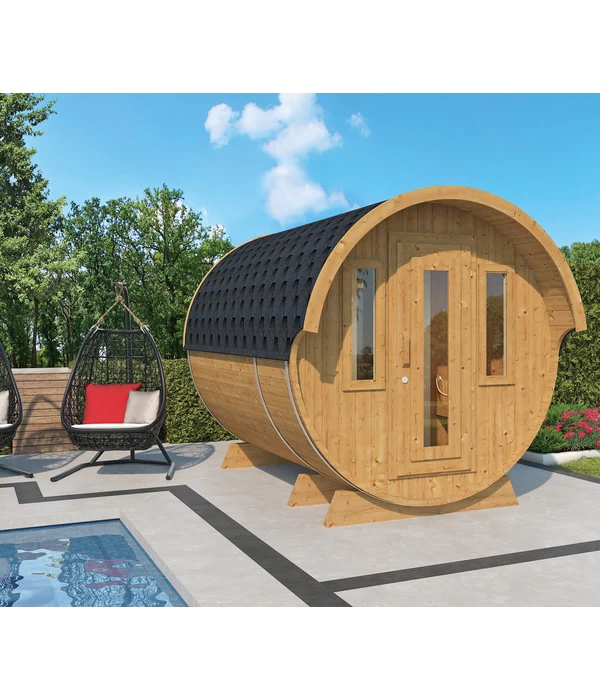 Sie träumen schon seit langem von einer eigenen Sauna, aber im Haus ist definitiv kein Platz? Und Ihr Garten ist auch kein Park? Dann könnte das Wolff Finnhaus Saunafass 330 de luxe montiert die Lösung sein. Im Inneren befindet sich eine vollwertige Sauna, sie braucht aber nur wenige Quadratmeter Platz im Garten. Und mit der rustikalen Fass-Optik ist es ein echter Hingucker. Die eigene Sauna im Garten steht immer für Sie bereit. An jedem Tag und zu jeder Tageszeit. Ohne lästige Anfahrt und Parkplatzsuche. Genießen Sie bald das besondere Vergnügen, sich auf den 210 cm langen Bänken in der Sauna auszustrecken und die wohltuende Hitze auf der Haut zu spüren. Und wenn Sie genug geschwitzt haben, kühlen Sie sich draußen in der frischen Luft ab. Dafür ist das Wolff Finnhaus Saunafass 330 de luxe montiert zusätzlich mit einem überdachten Vorraum mit zwei Sitzbänken ausgestattet.