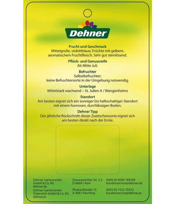 Setzen Sie die Zwetschge ‘Katinka‘ an einen sonnigen bis halbschattigen Standort mit einem nährstoffreichen und durchlässigen Boden und die Pflanze wird (fast) wunschlos glücklich sein. Geben Sie dem jungen Obstgehölz gleich beim Einpflanzen einen Stützpfahl und gießen Sie im ersten Jahr regelmäßig. Später sind gelegentliche Düngergaben und ein regelmäßiger Rückschnitt nötig, um eine reiche Ernte sicherzustellen.